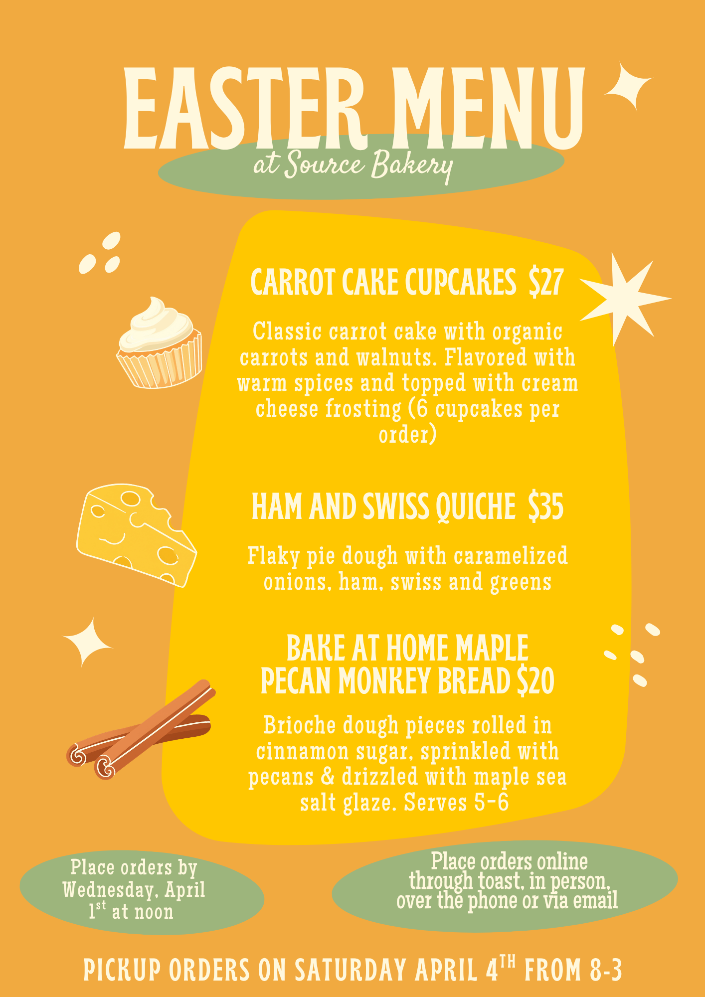 All orders will be scheduled for pick up on Saturday, 4/4 between 8 AM & 3 PM. Orders close on Wednesday, 4/1 at 12 PM! We will be CLOSED on Easter, Sunday 4/5.